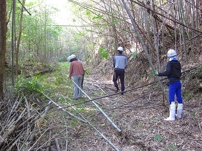 里山・田園保全ボランティア実習 1日目 いよいよ、2泊3日のボランティア実習が始まりました。 少し緊張の顔合わせ。 リーダー講座参加者と、80日間黒木町でワークキャンプを行っているメンバーと全員で 輪になって自己紹介を行いました。 今回は全体を3チームに分け、 各グループに外国人のリーダーと、通訳のできる80日ボランティアの日本人が入り、 チームごとに各ワーク(作業)や、炊事・掃除などを行いました。 初日の作業は竹伐り。 第2回の専門講座で行ったように、リスクアセスメントを充分に行い、 注意を促してから作業に取り掛かります。 枯れて倒れかかっていたり、込み合っている竹などを伐り倒し、 お風呂のボイラー用の薪や竹馬用として運び出しました。 今回、リーダー講座の参加者の中には、保全作業自体が初めてという方も多く、 なれない様子で作業にとりかかる方もいらっしゃいました。 作業終了後の振り返りでは、 まだ初日ということもあり、コミュニケーションのとり方や、 作業の分担、指示の仕方などが難しいなど、いろいろな課題が出されました。 課題は多いですが、残り2日のワークに充分活かせる話ができたのではと思います。 今回は、炊事や掃除もチームごとに行いました。 ワークだけではなく、特にこの生活面での仕事でコミュニケーションを図ることで、 少しずつ緊張がほぐれて来たのではないかと思います。 いよいよ明日は1日フルに活動する「遊歩道整備」を行います!